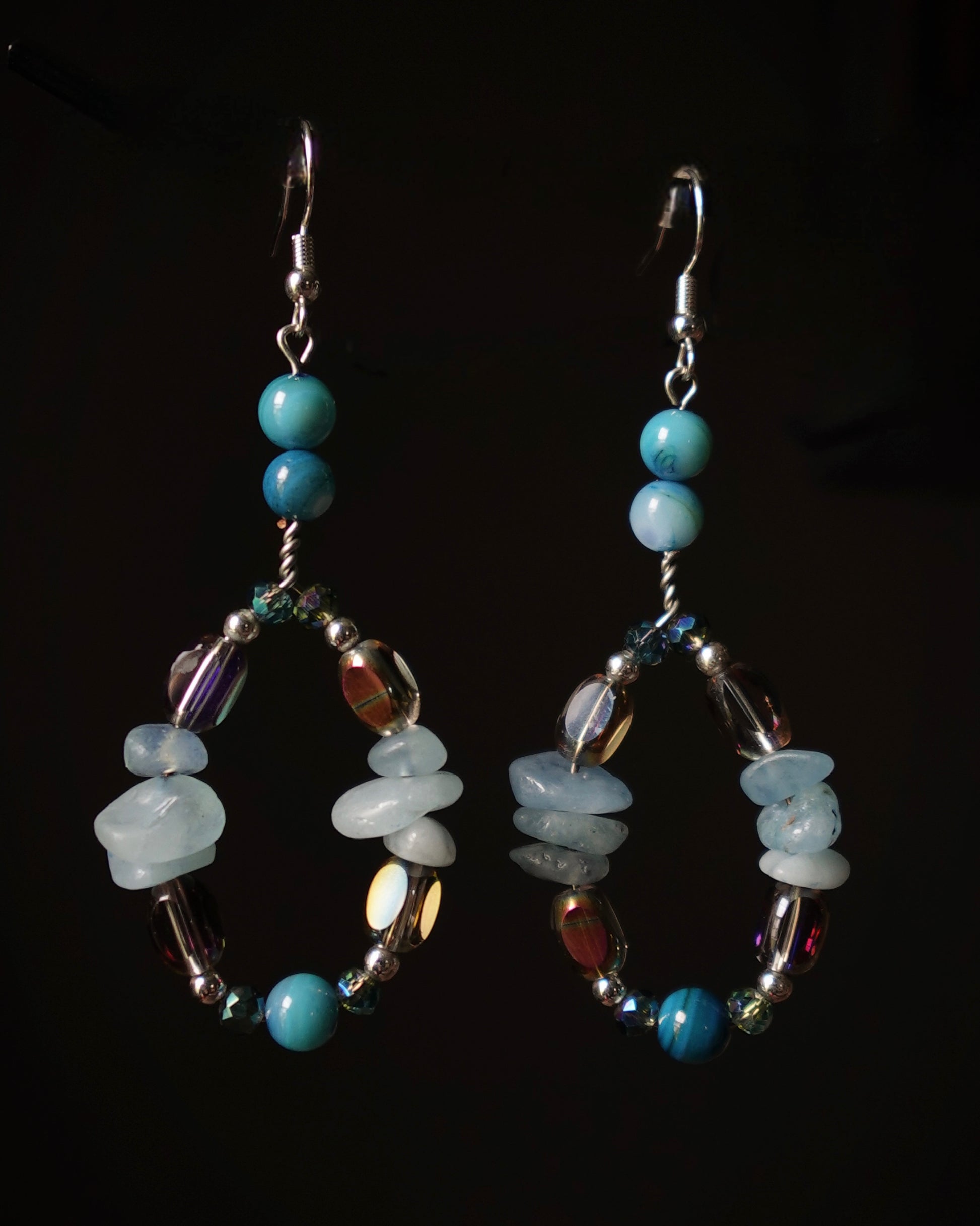 Metallic beads, glass beading, aquamarine chips and river shell.